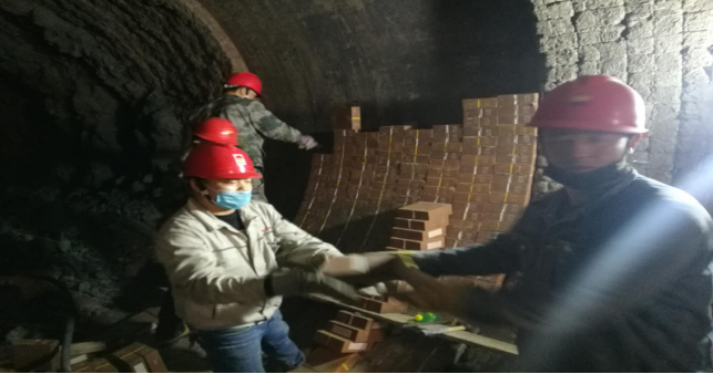 在回轉(zhuǎn)窯挖補(bǔ)窯磚現(xiàn)場(chǎng),他們手傳手,開展接力,窯磚補(bǔ)填……
