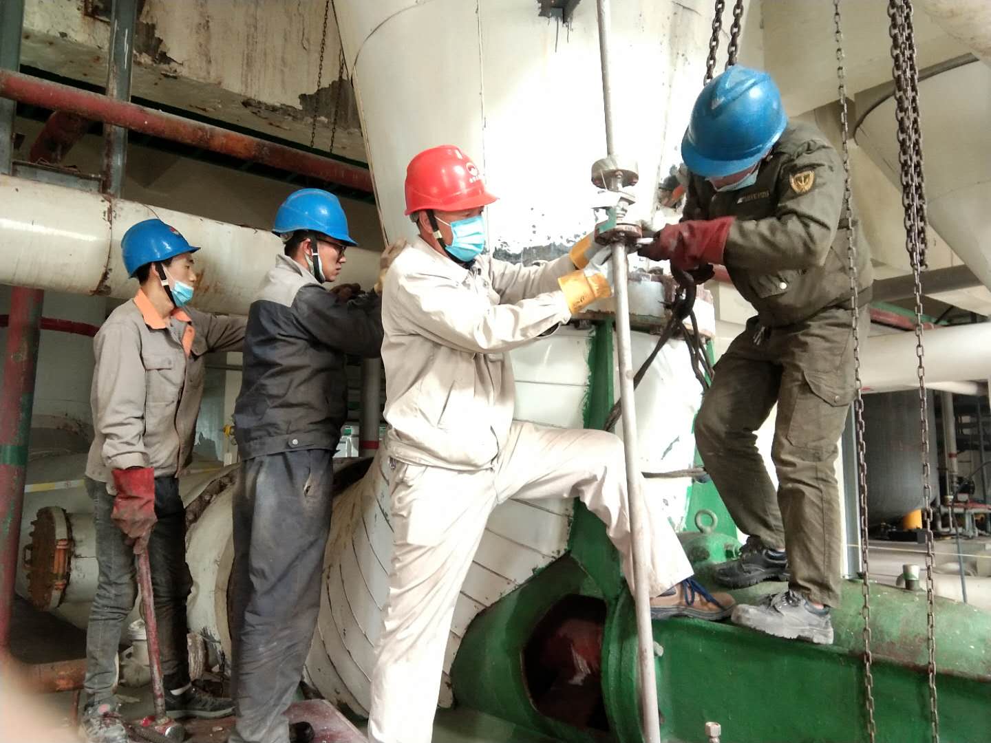 團(tuán)結(jié)就是力量。“加油,一、二、起,一、二、起……”一聲聲鏗鏘有力的口號(hào)響徹廠區(qū),這是一群可愛的人正在更換引風(fēng)機(jī)軸承的情景。