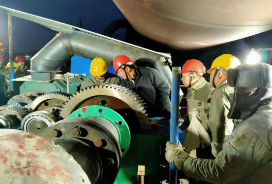 1月4日,塞北二九天氣,室外溫度已在零下16℃左右,傍晚夜幕降臨,員工們在燈火通明的回轉(zhuǎn)窯主減速機(jī)檢修現(xiàn)場(chǎng),迎著寒風(fēng)刺骨,卻是熱火朝天,一派繁忙大干的景象。由于生產(chǎn)任務(wù)重,檢修時(shí)間緊,公司領(lǐng)導(dǎo)班子帶領(lǐng)員工克服種種困難,戰(zhàn)勝諸多不利因素,不畏嚴(yán)寒,加班加點(diǎn)趕進(jìn)度,爭(zhēng)分奪秒搶工期,積極推進(jìn)回轉(zhuǎn)窯主減速機(jī)恢復(fù)正常運(yùn)行。