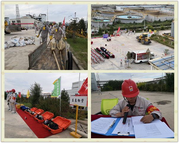 “報(bào)告總指揮,各演練部門準(zhǔn)備完畢,氯乙烯球罐單體泄漏應(yīng)急演練是否開始!薄伴_始!”隨著演練總指揮、片區(qū)副總經(jīng)理、廣拓能源總經(jīng)理賈存富的一聲令下,應(yīng)急演練正式開始!北敬窝菥氃O(shè)定為一般突發(fā)事件應(yīng)急響應(yīng),演練內(nèi)容是:廣拓能源有限公司廢酸處理稀硫酸罐排污閥泄露,由于稀硫酸泄漏量較大,啟動(dòng)突發(fā)應(yīng)急預(yù)案。主要演練現(xiàn)場(chǎng)警戒、人員撤離、筑壩攔截預(yù)防稀硫酸外溢、危險(xiǎn)廢物收集。